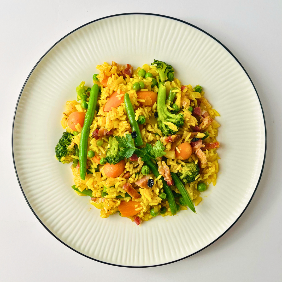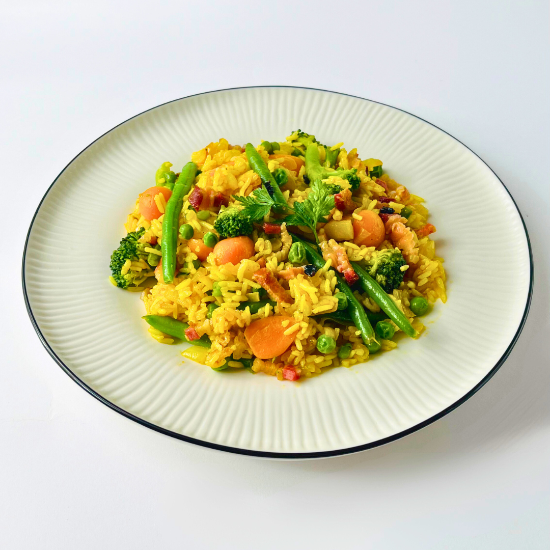 Шри-ланкийский бириани с панчеттой, восточными специями и миксом овощей