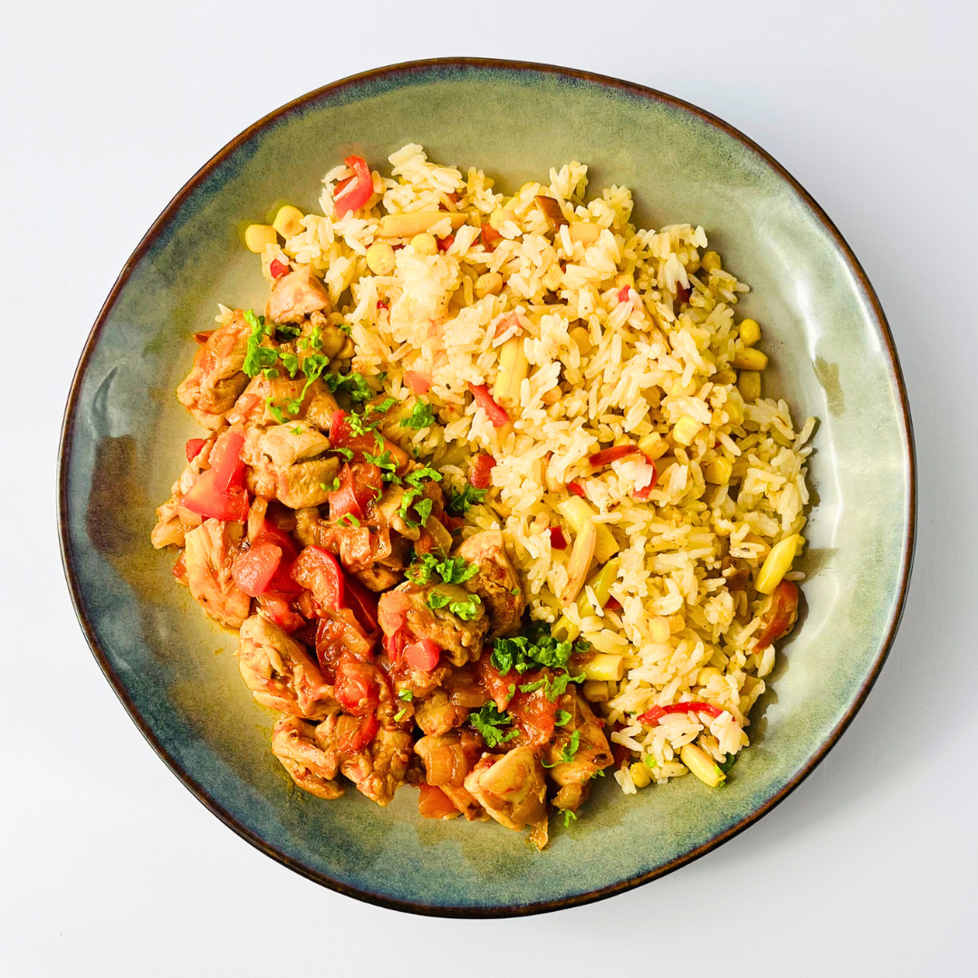 Ароматное блюдо в мексиканском стиле — сочная курица чипотле в остром, пряном соусе с рисом, кукурузой, фасолью и сладким перцем. Лёгкое, питательное и яркое блюдо с насыщенным вкусом специй тако и перца чили.