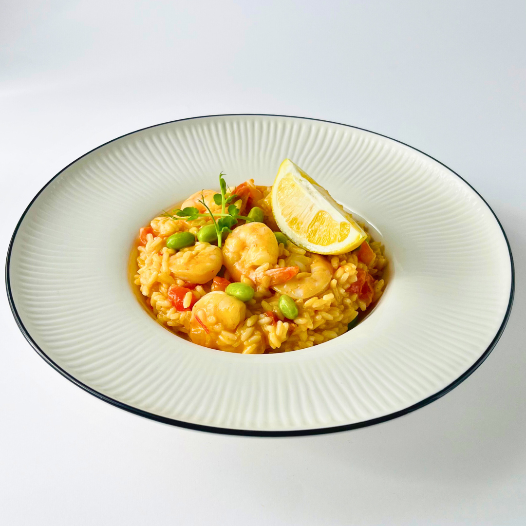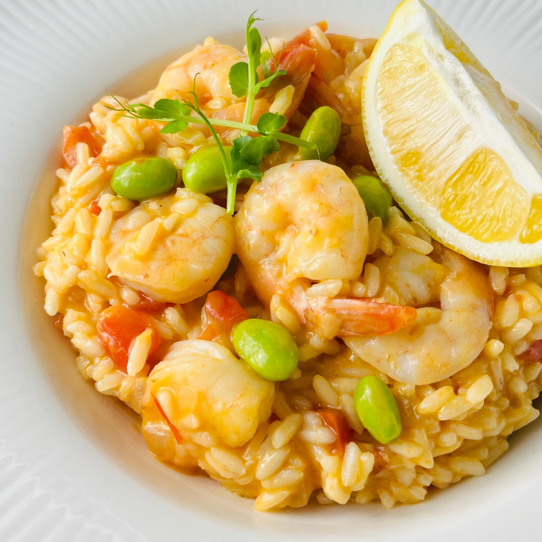 Кремовое ризотто на кокосовом молоке с яркими нотами том ям, сочными королевскими креветками и бобами эдамаме. Пряное, насыщенное и сбалансированное блюдо с цитрусовой свежестью и сырной нежностью.