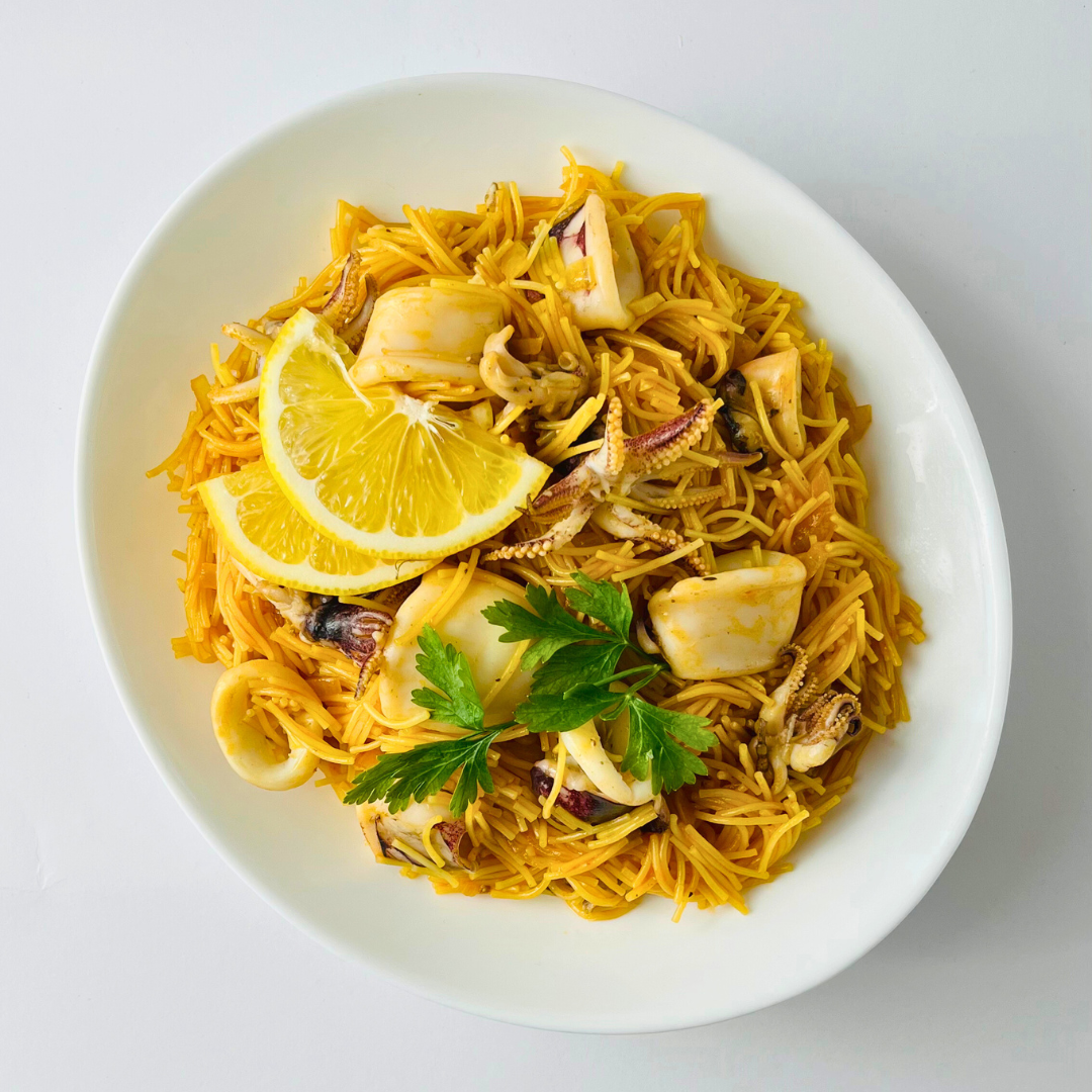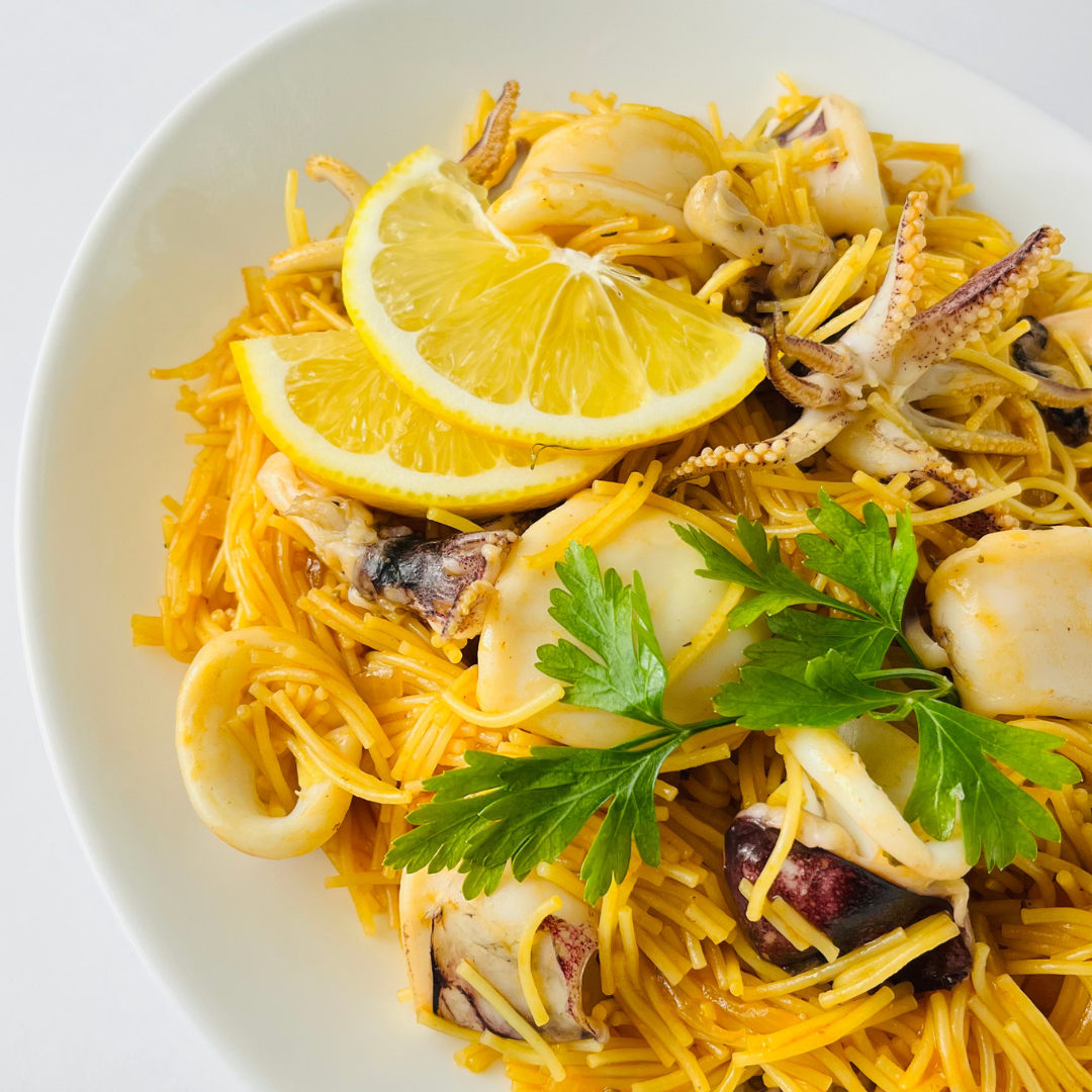 Лёгкая и ароматная интерпретация испанской паэльи — фидеуа, приготовленная на основе обжаренной пасты, нежных кальмаров и томатной пассаты. Пряные специи, куркума, сладкая паприка и рыбный соус создают насыщенный средиземноморский вкус, а свежая петрушка добавляет яркости.