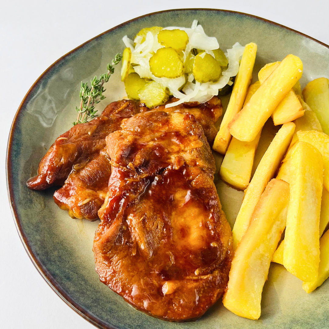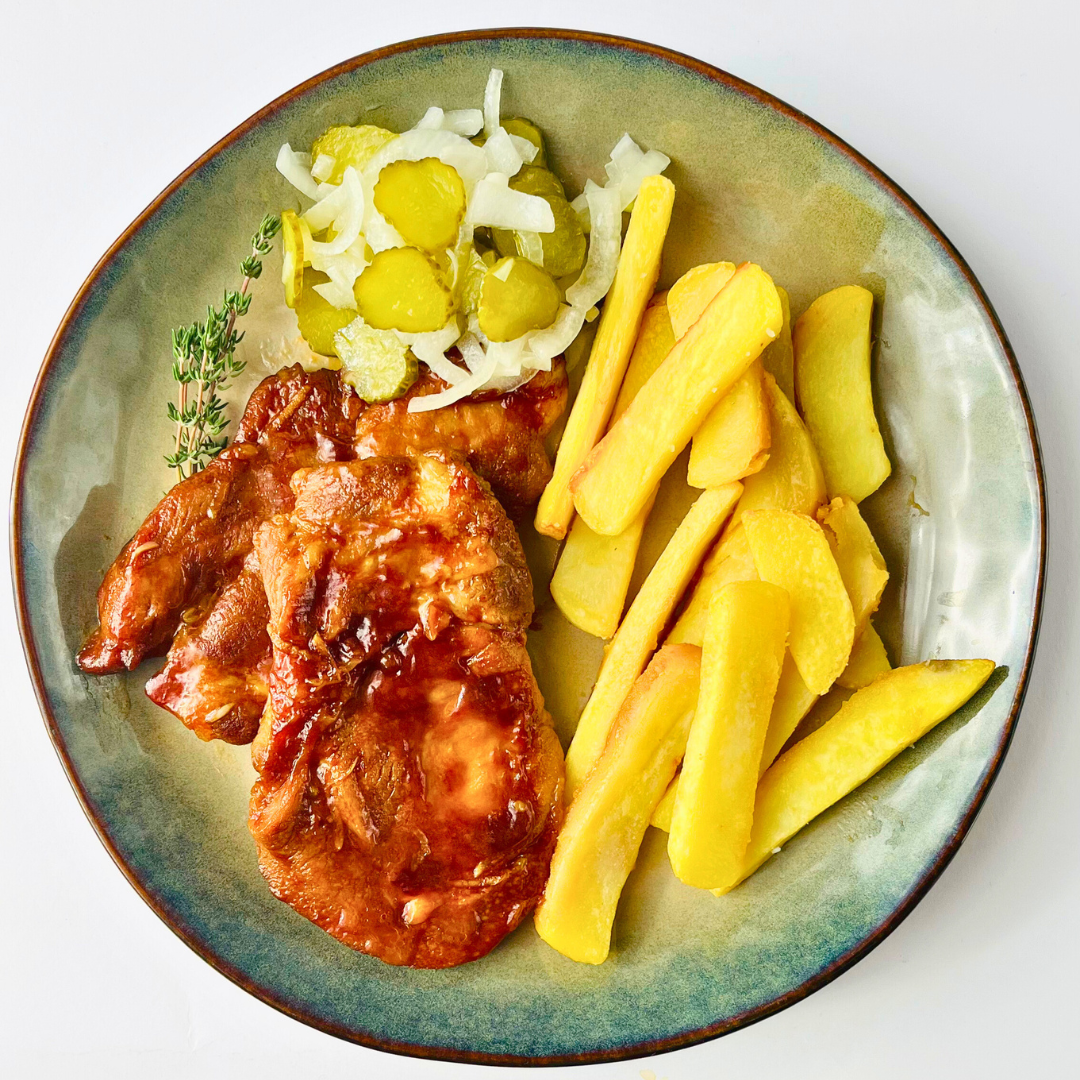 Сочная свиная шея, запечённая до румяной корочки, пропитывается ароматным соусом на основе соевого соуса, мёда и цитрусового юдзу с лаймом. Картофель по-деревенски получается мягким внутри и золотистым снаружи, а маринованные огурчики с луком добавляют блюду свежесть и лёгкую кислинку, делая вкус ярким и сбалансированным.