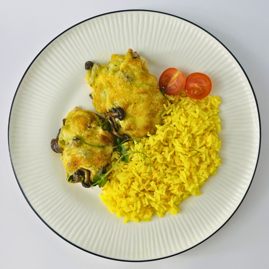 Куриная отбивная, запечённая с грибами намеко под сырной шапочкой с рисом