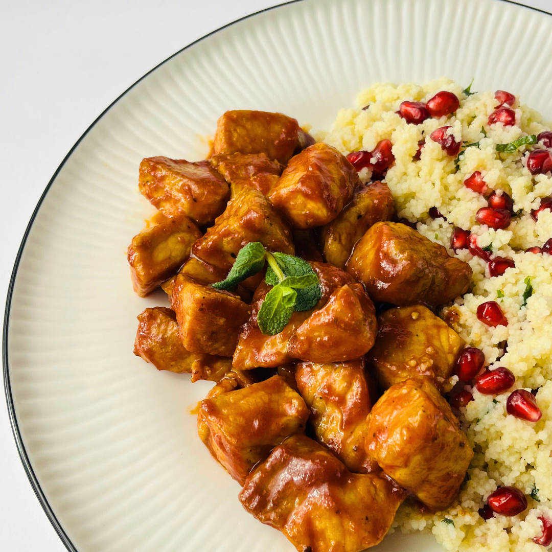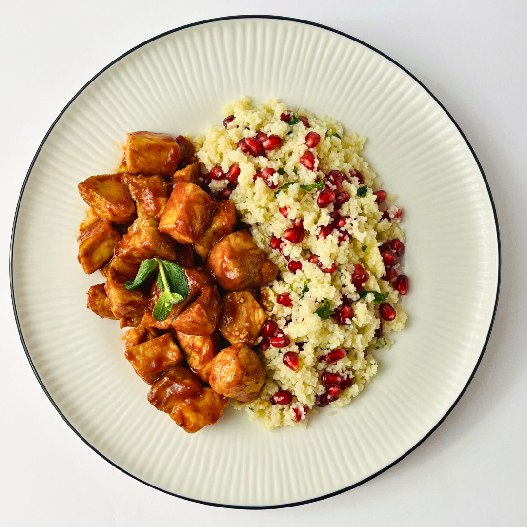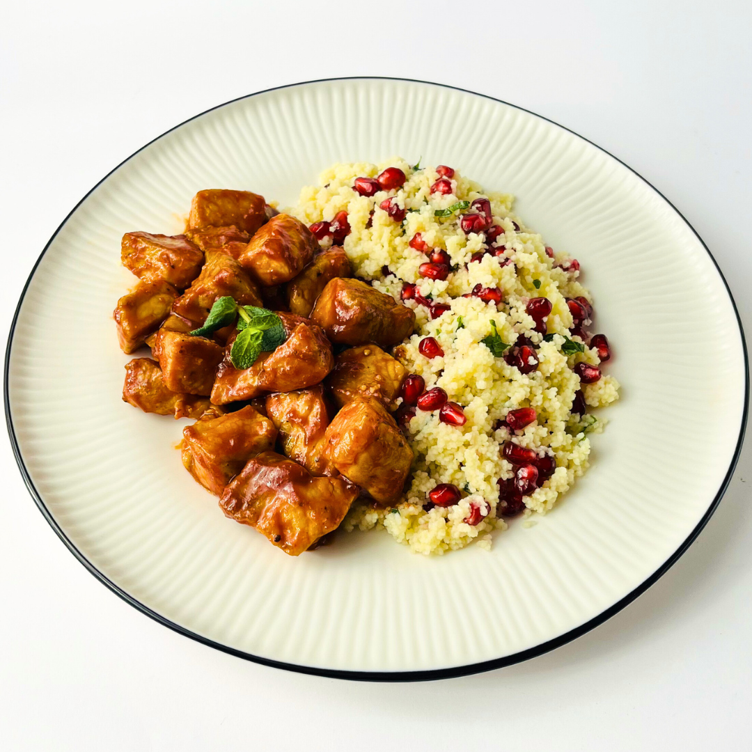 Свинина в соусе барбекю с кускусом, гранатом и мятой
