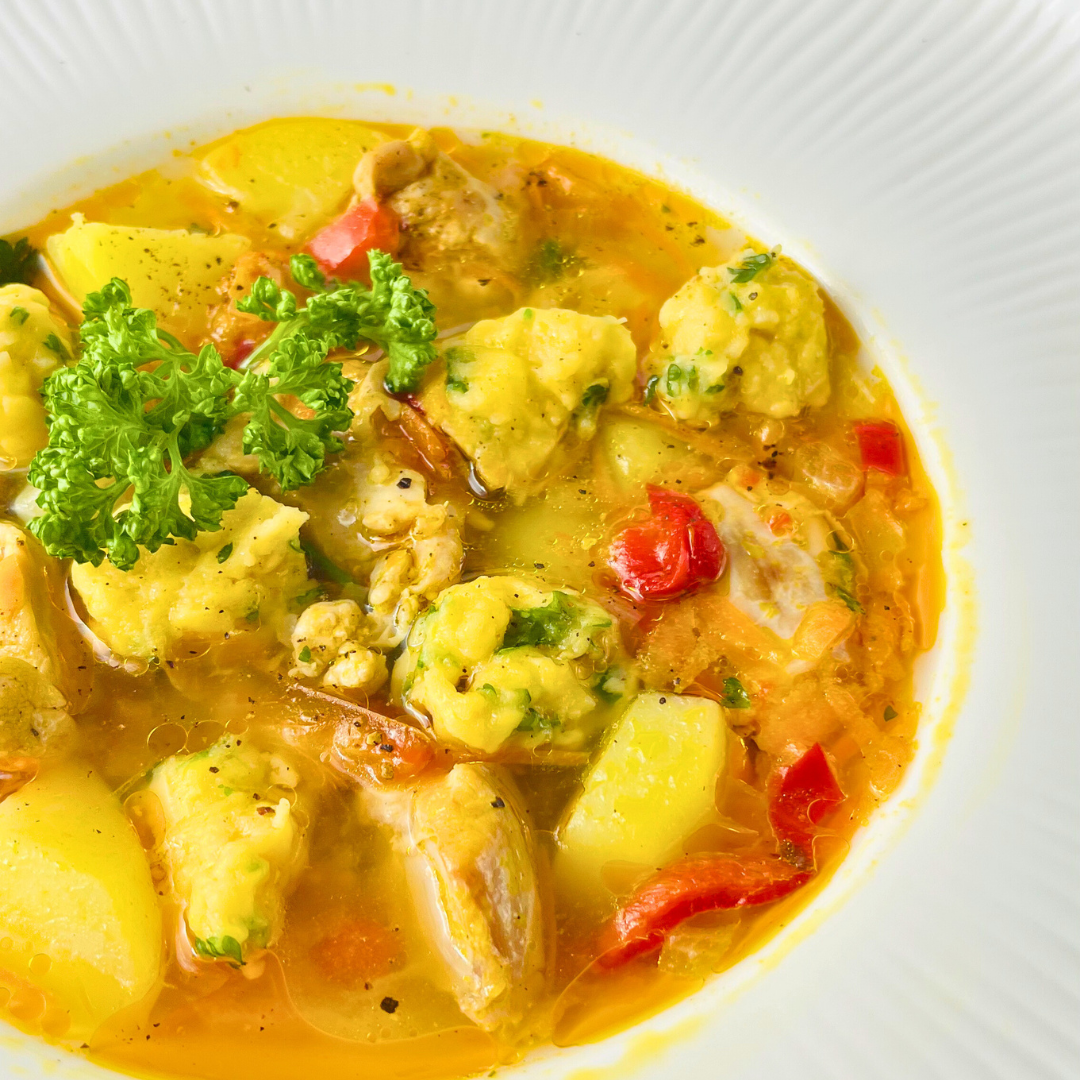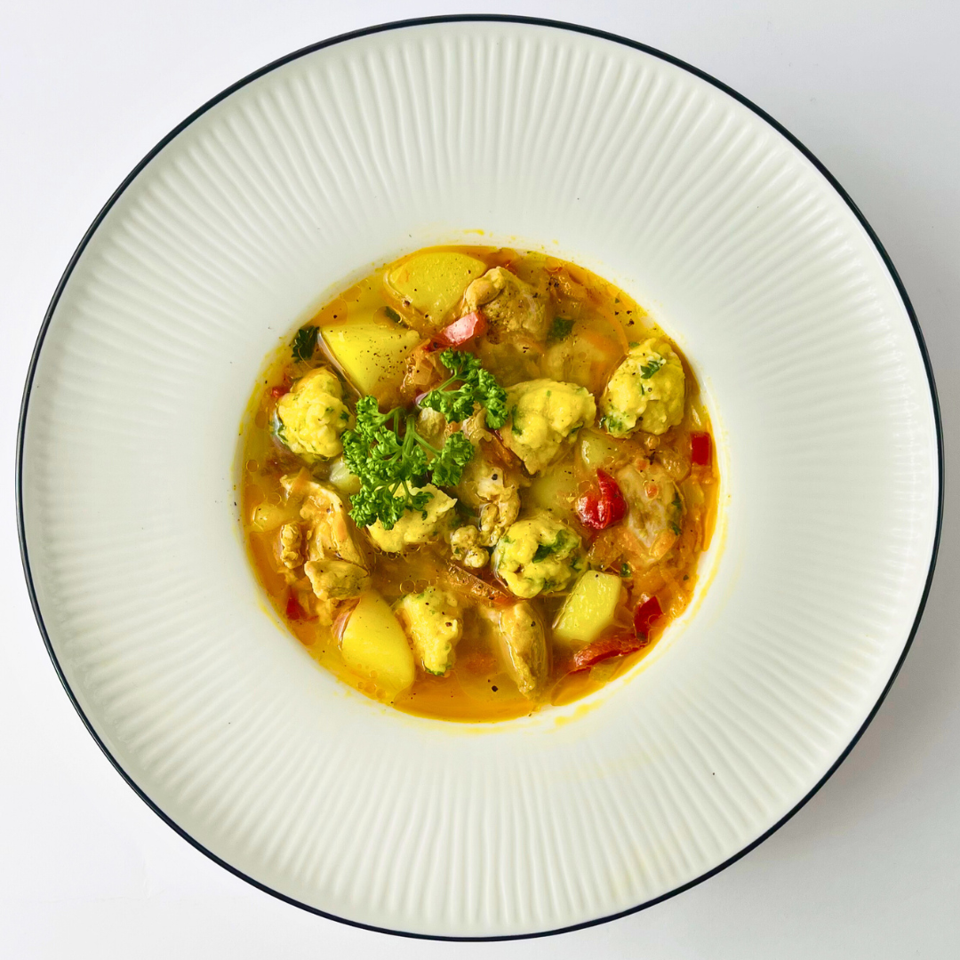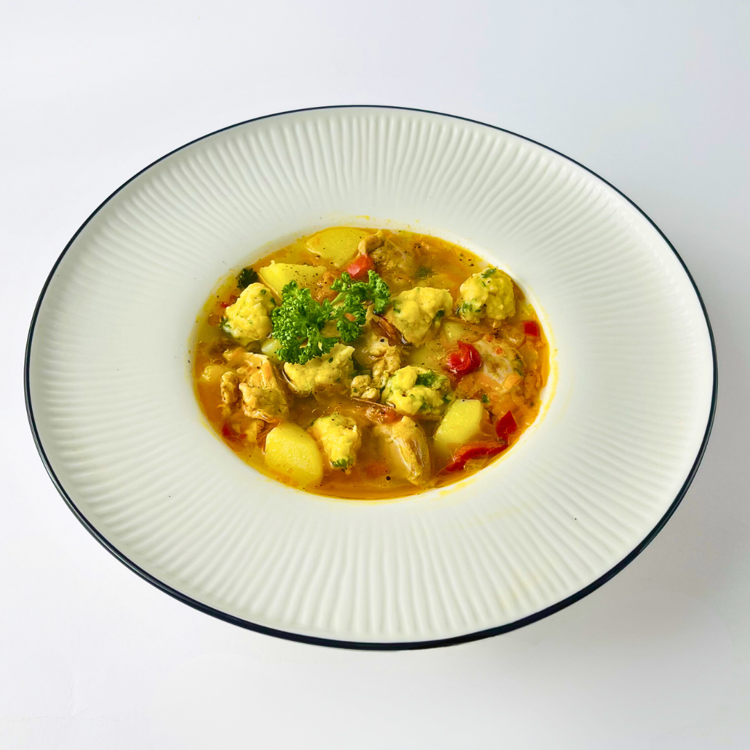 Лёгкий и ароматный куриный суп с мягкими кусочками бедра, сладким перцем и картофелем согревает и дарит ощущение домашнего уюта. Нежные клёцки с чесноком и свежей петрушкой делают текстуру блюда особенно приятной и сытной.