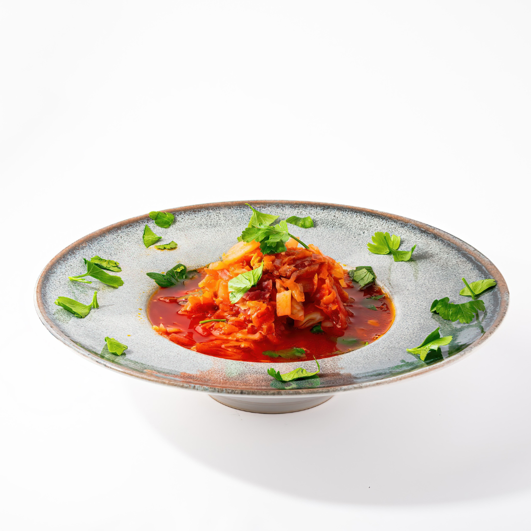 Пилећи бут, полукувана цвекла, свежа шаргарепа, бели лук, кромпир, бели купус, црни лук, француски першун, шећер, сирће, ловоров лист, концентрат парадајза