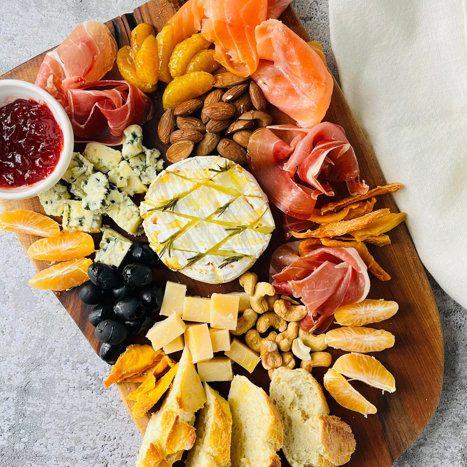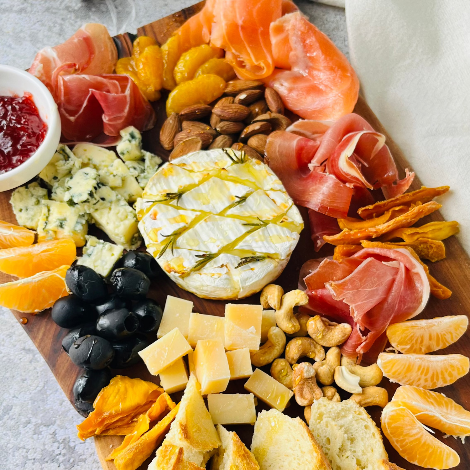 Идеальная праздничная закуска: горячий тягучий камамбер с розмарином, хамон, лосось, три вида сыров, орехи, мандарины и хрустящий багет. Очень эффектная тарелка, которая собирается за 20 минут и выглядит как ресторанная подача.