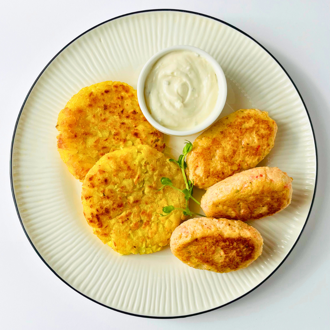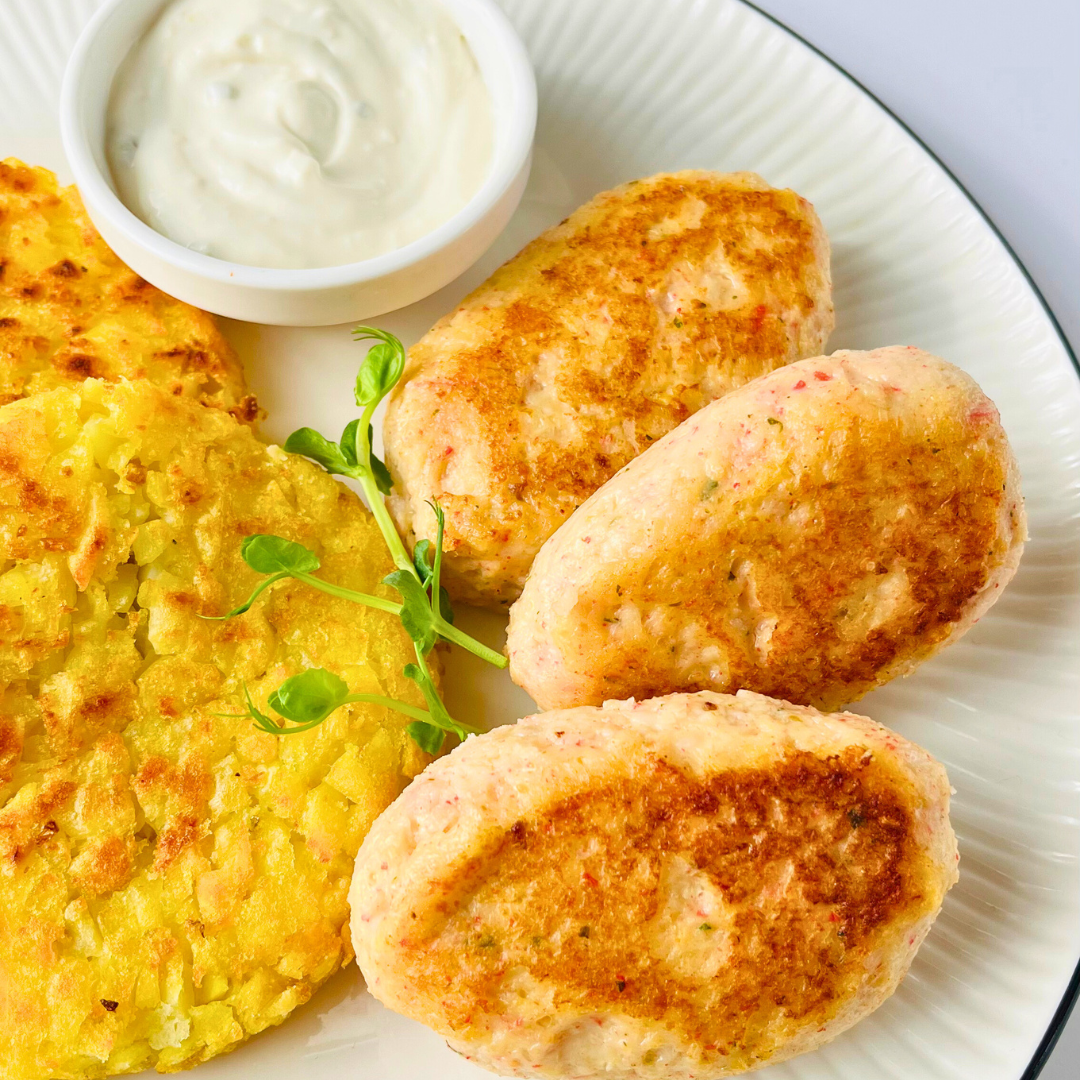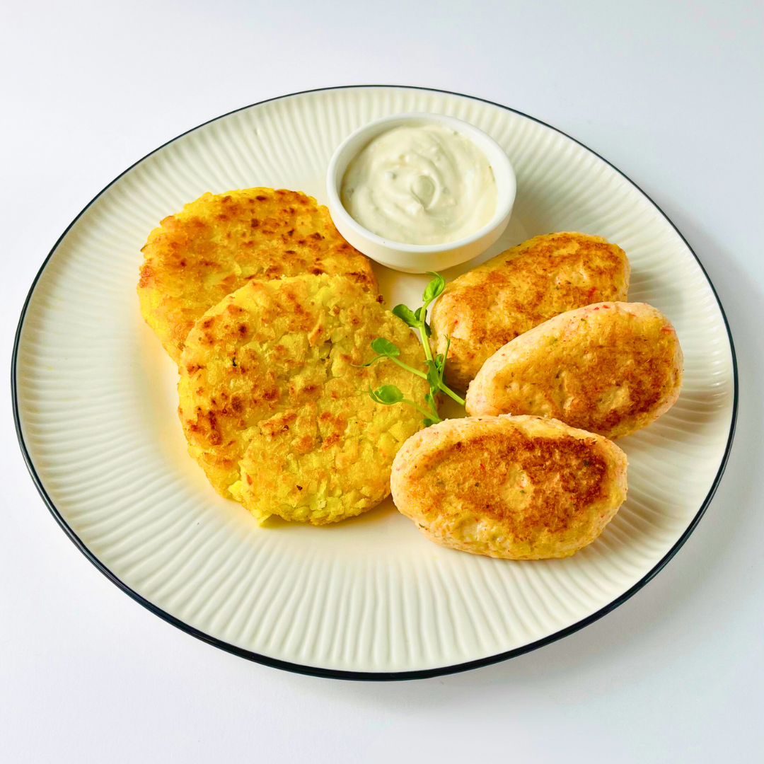 Нежные котлеты из лосося и крабового сурими с мягким сыром и сливочными нотами. Благодаря булочке, вымоченной в молоке, текстура получается особенно сочной и воздушной. Подаются с румяным хашбрауном с хрустящей корочкой и классическим соусом тартар — сытное и гармоничное блюдо с ярким морским вкусом.